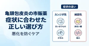 亀頭包皮炎の市販薬選びに迷う方へ。カンジダ性・細菌性の見分け方、ドラッグストアで購入できる軟膏の種類、受診の目安、再発予防のセルフケアまで医学的観点から詳しく解説します。