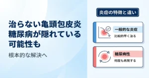 治らない亀頭包皮炎や陰部の激しいかゆみ、ペニスの皮の裂傷は「糖尿病性亀頭包皮炎」の可能性があります。本記事では、糖尿病と包皮炎の関係や市販薬の自己判断リスク、パートナーへの感染リスク、包茎治療クリニックでの根本的な解決方法を詳しく解説します。
